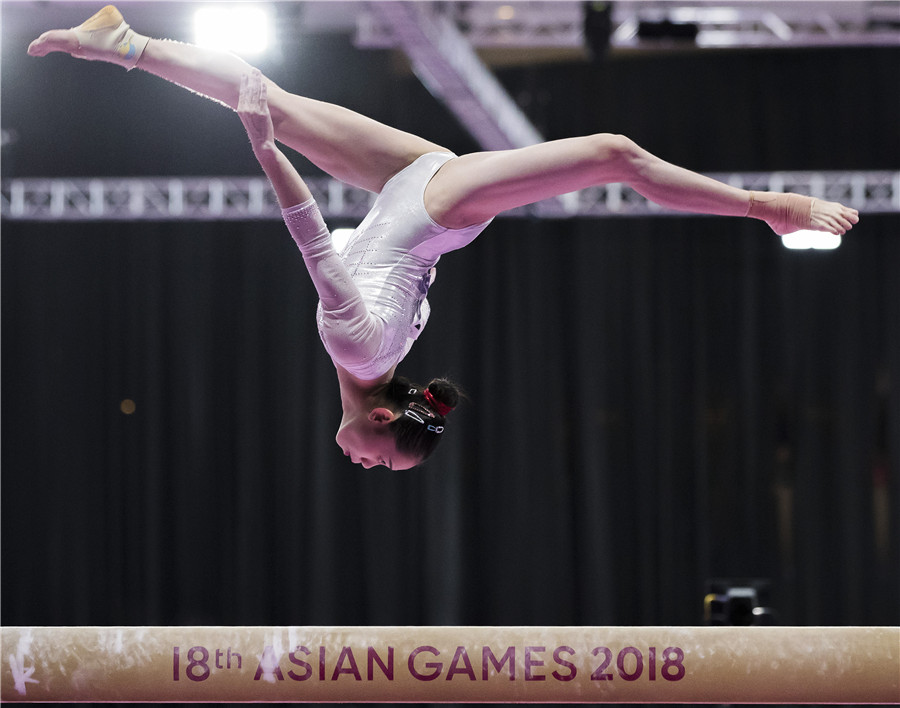 圖為8月22日,中國隊選手劉婷婷在第18屆亞運會體操女子團體決賽平衡木比賽中。中國隊以165.250分獲得冠軍。新華社記者朱煒攝