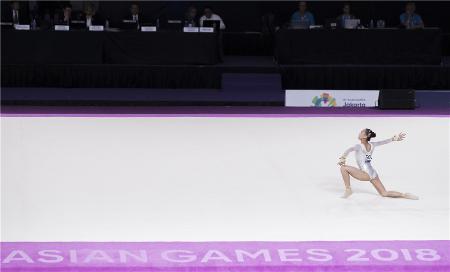 圖為8月22日,中國隊選手陳一樂在第18屆亞運會體操女子團體決賽自由操比賽中。中國隊以165.250分獲得冠軍。新華社記者朱煒攝