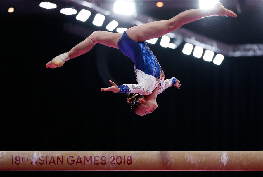 圖為8月24日,中國選手陳一樂在第18屆亞運會體操女子平衡木決賽中。陳一樂獲得金牌。新華社記者王麗莉攝