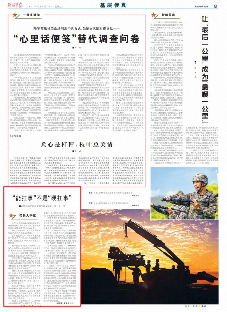 “交任務(wù)”不再一“交”了之。做法一變,效果很快顯現(xiàn)。戰(zhàn)士鄭國勁軍事素質(zhì)比較突出,但組織能力較弱。為此,我特意安排他牽頭組織部分基礎(chǔ)訓(xùn)練,鼓勵他積累帶隊經(jīng)驗。在他組訓(xùn)過程中,我還會根據(jù)他的表現(xiàn)及時指出問題,提出改進(jìn)建議。此外,我安排經(jīng)驗豐富的班長與他結(jié)對,幫助他熟悉日常工作。如今,鄭國勁不僅走上了班長崗位,還帶領(lǐng)全班戰(zhàn)友在最近考核中取得了全優(yōu)成績。