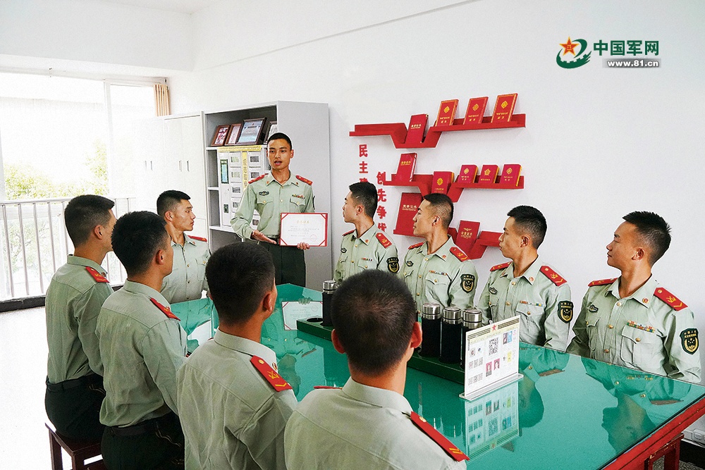 支隊戰(zhàn)士在班排“榮譽角”分享奮斗經(jīng)歷。聶凱 攝