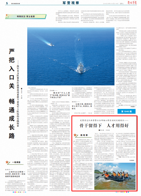 在今年夏秋季選晉中,該支隊(duì)成立由紀(jì)檢監(jiān)察、訓(xùn)練、裝備等部門(mén)組成的聯(lián)合審查組,開(kāi)展“過(guò)篩子”式核查,先后發(fā)現(xiàn)幾人不符合基本條件,均依規(guī)取消選晉資格?!斑^(guò)去認(rèn)為‘差不多就行’,現(xiàn)在是‘差一點(diǎn)都不行’?!蹦炒箨?duì)姜教導(dǎo)員說(shuō),嚴(yán)格資質(zhì)要求,倒逼士兵精進(jìn)專業(yè),不是要卡誰(shuí),而是要保戰(zhàn)斗力,平時(shí)差不多,戰(zhàn)時(shí)就可能差很多。