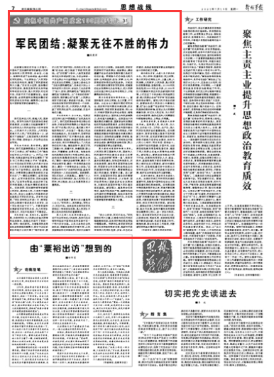 習(xí)主席強調(diào):“最偉大的力量是同心合力?!避娒裢?,其利斷金;軍民合力,無往不勝。始終堅持發(fā)揮軍政軍民團結(jié)這一特有政治優(yōu)勢,是人民軍隊不斷從勝利走向勝利的重要原因。