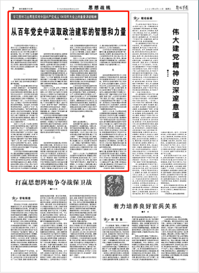 從百年黨史中汲取政治建軍的智慧和力量,就是要不斷強化“政治工作永遠是我軍的生命線”意識,牢固樹立戰(zhàn)斗力這個唯一的根本的標(biāo)準(zhǔn),聚焦能打仗、打勝仗這個根本要求,服務(wù)保證戰(zhàn)斗力建設(shè),確保政治工作有效貫穿戰(zhàn)斗力建設(shè)各環(huán)節(jié)、融入軍事斗爭準(zhǔn)備全過程,著力提高政治工作對備戰(zhàn)打仗的貢獻率,使“生命線”不斷煥發(fā)生命力。