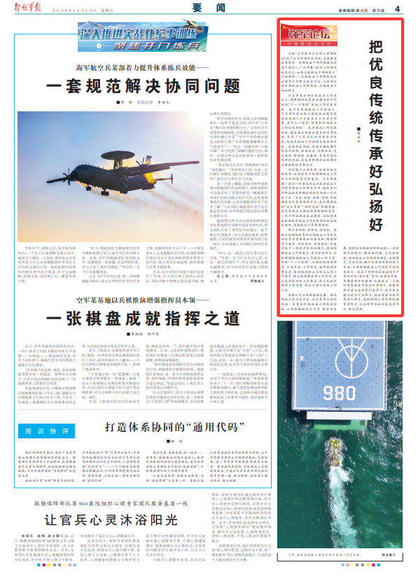 守住根子上的東西,弘揚(yáng)傳統(tǒng)上的優(yōu)勢(shì),這是我軍不斷增強(qiáng)政治工作時(shí)代性和感召力的基石。習(xí)主席強(qiáng)調(diào):“我們一定要深刻認(rèn)識(shí)我軍政治工作的重要地位和重大作用,把先輩們用鮮血和生命鑄就的優(yōu)良傳統(tǒng)一代代傳下去。”當(dāng)前,世情、國(guó)情、黨情、軍情都在發(fā)生復(fù)雜深刻變化,我們黨面臨的“四大考驗(yàn)”“四種危險(xiǎn)”長(zhǎng)期存在,我軍在政治上面臨的考驗(yàn)錯(cuò)綜復(fù)雜。一刻不停地推進(jìn)政治建軍,迫切需要各級(jí)把我軍政治工作優(yōu)良傳統(tǒng)傳承好弘揚(yáng)好,推動(dòng)政治工作提質(zhì)增效。