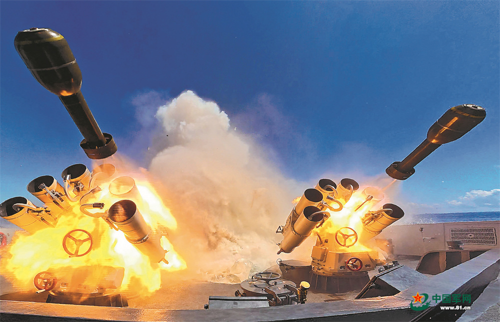 不多時,某護(hù)衛(wèi)艦率先鎖定目標(biāo)?!鞍l(fā)射!”指揮員果斷下達(dá)攻擊指令,數(shù)枚火箭深彈脫膛而出撲向目標(biāo),海面激起數(shù)米高的水柱。