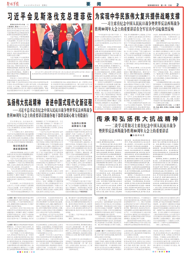 “中華民族偉大復(fù)興勢(shì)不可擋!人類(lèi)和平與發(fā)展的崇高事業(yè)必將勝利!”9月3日,習(xí)主席出席紀(jì)念中國(guó)人民抗日戰(zhàn)爭(zhēng)暨世界反法西斯戰(zhàn)爭(zhēng)勝利80周年大會(huì)并發(fā)表重要講話(huà),在全軍官兵中引起強(qiáng)烈反響。
