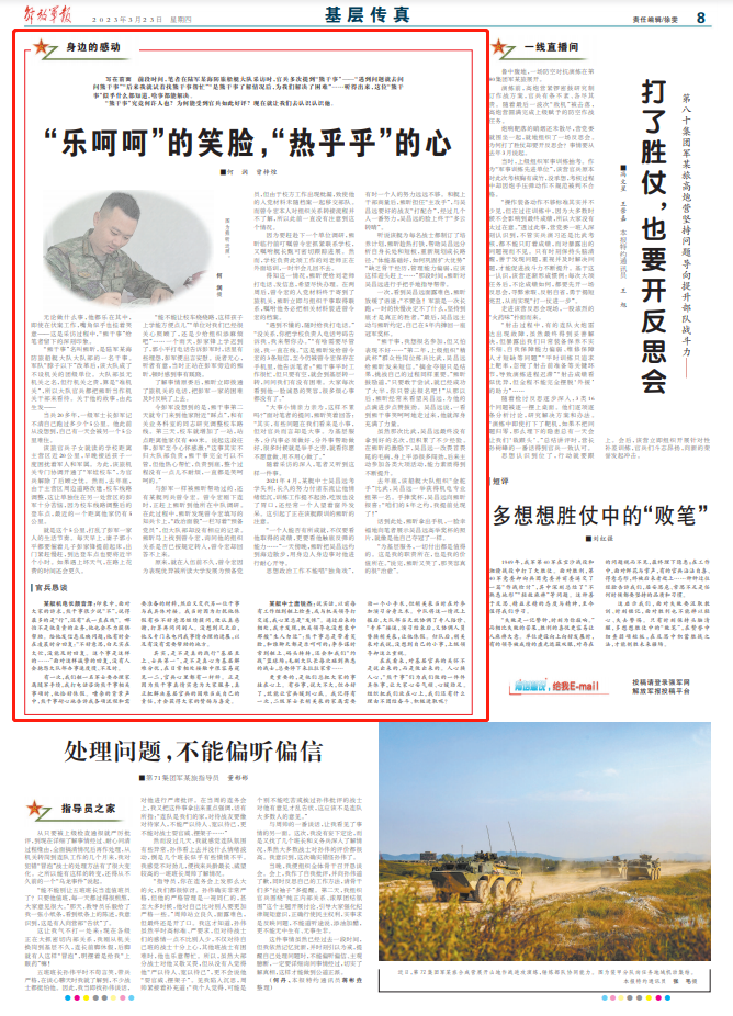 其實(shí),是不是真的踐行“基層至上、士兵第一”,是不是真心為基層解難分憂,在日常相處接觸中很容易窺見(jiàn)一二,官兵心里都有一桿秤。正是因?yàn)樾芨墒抡媲閷?shí)意為大家服務(wù),真正把解決基層官兵的困難當(dāng)成自己的責(zé)任,才會(huì)獲得大家的贊揚(yáng)與喜愛(ài)。