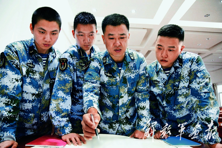 張磊(右二)為戰(zhàn)友傳授聲吶訓(xùn)練心得。