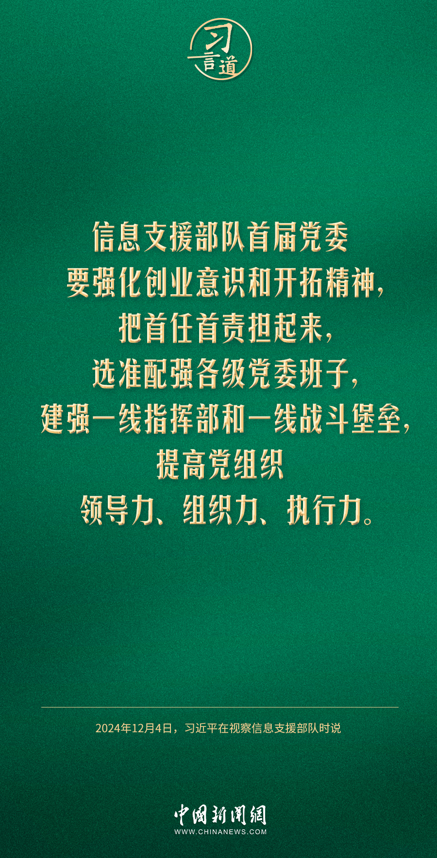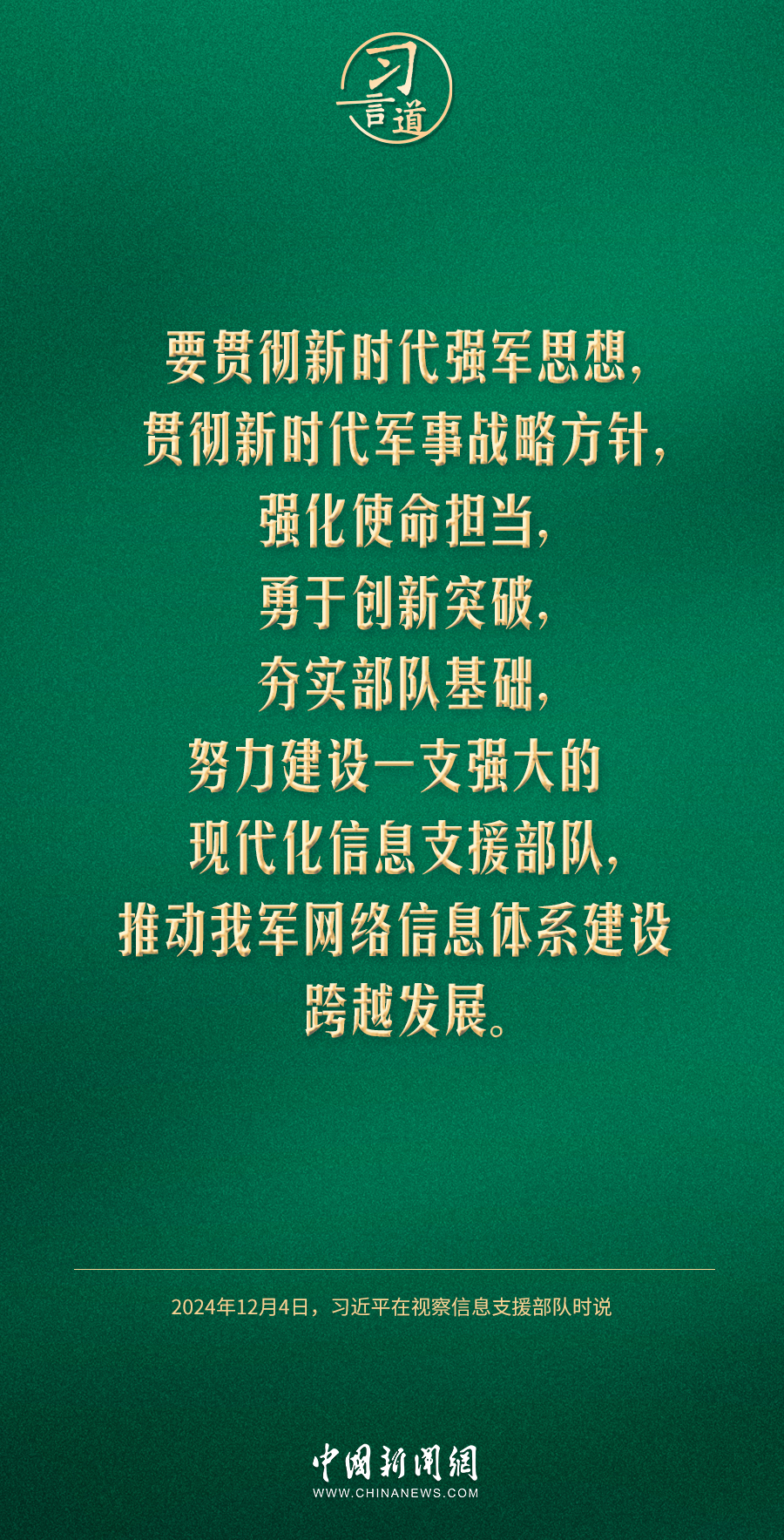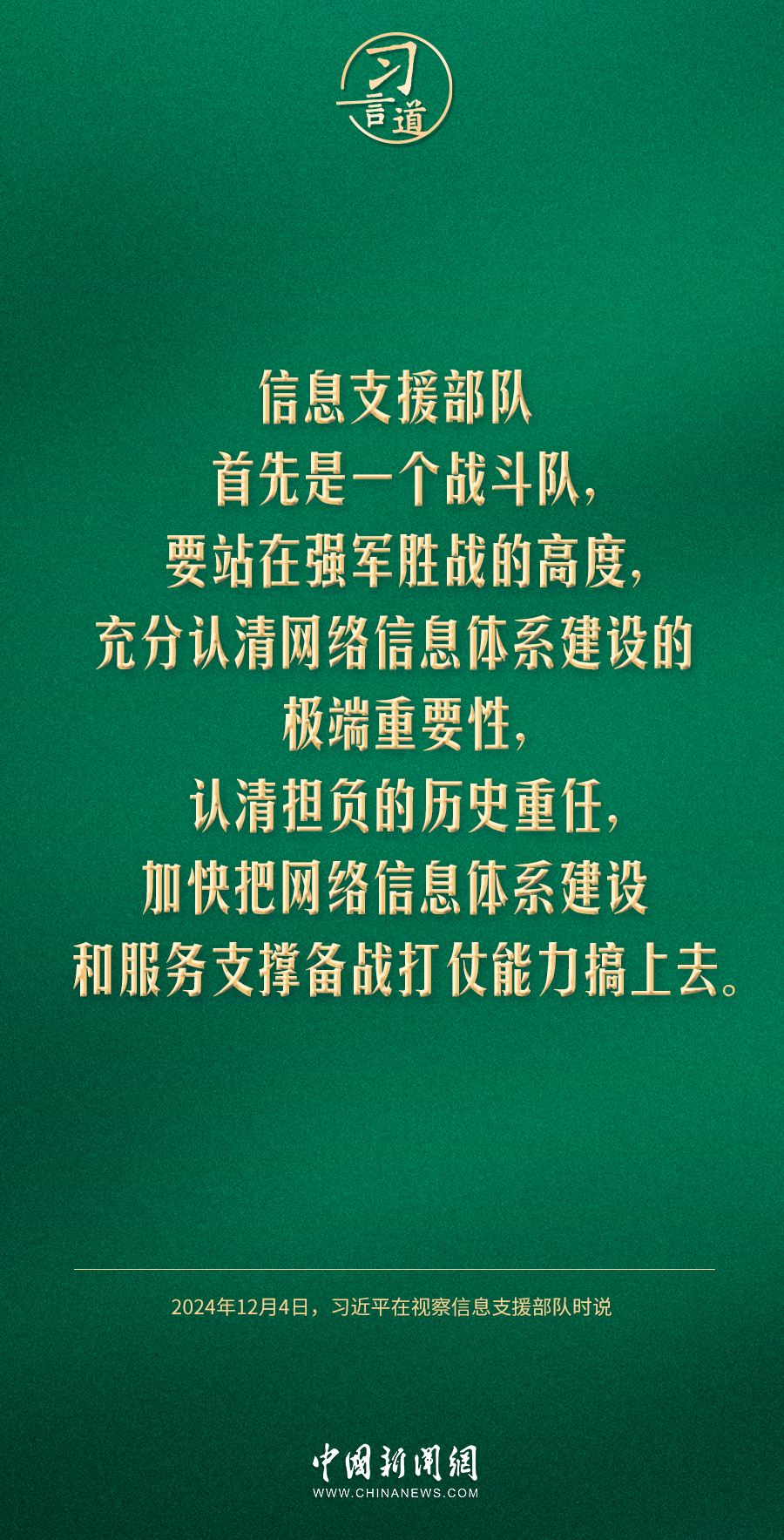 中共中央總書記、國家主席、中央軍委主席習(xí)近平4日視察信息支援部隊(duì),代表黨中央和中央軍委,對信息支援部隊(duì)第一次黨代表大會的召開表示熱烈祝賀,向信息支援部隊(duì)全體官兵致以誠摯問候。習(xí)近平指出——