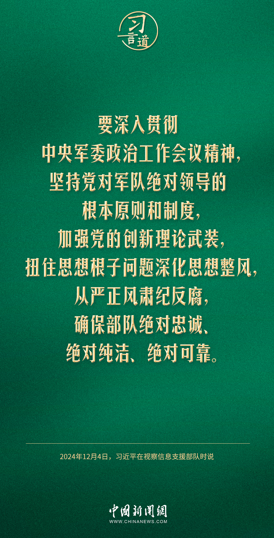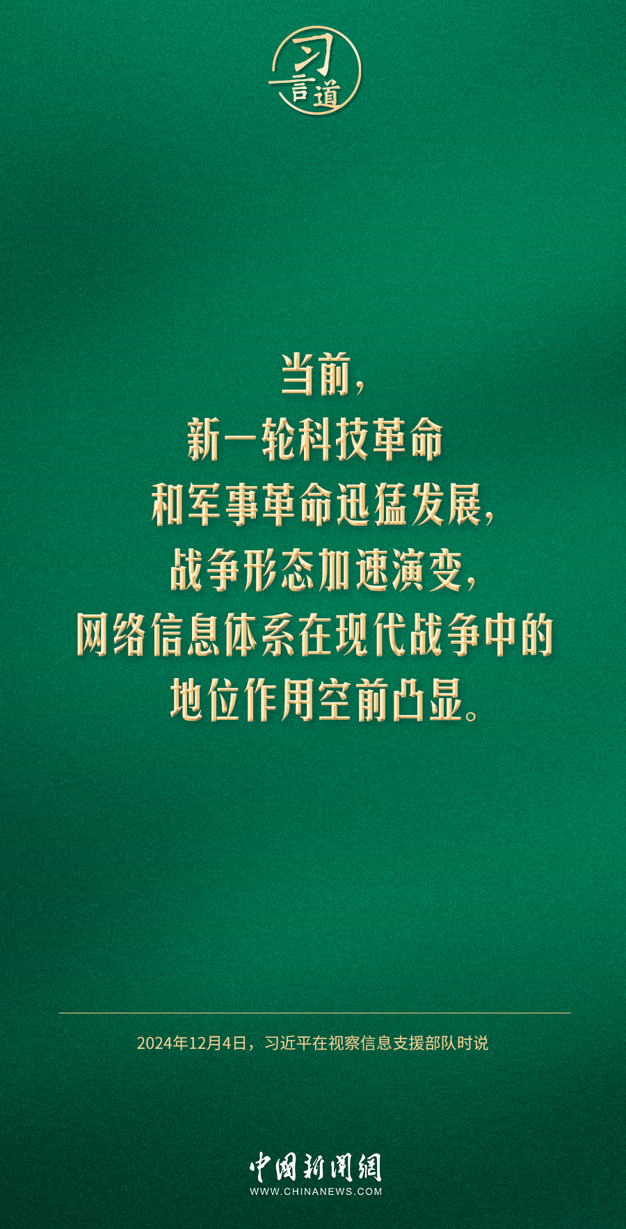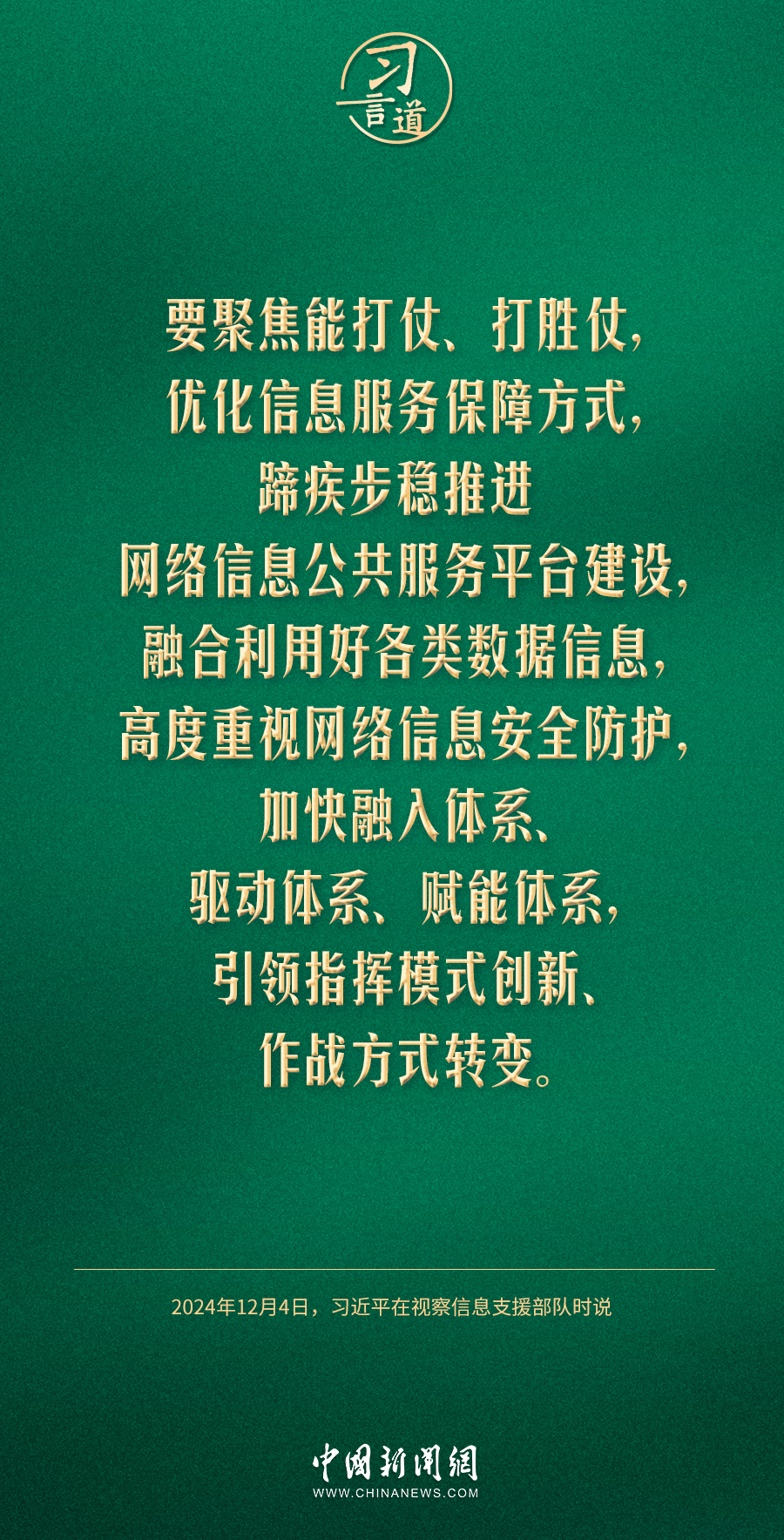 中共中央總書記、國家主席、中央軍委主席習(xí)近平4日視察信息支援部隊(duì),代表黨中央和中央軍委,對信息支援部隊(duì)第一次黨代表大會的召開表示熱烈祝賀,向信息支援部隊(duì)全體官兵致以誠摯問候。習(xí)近平指出——