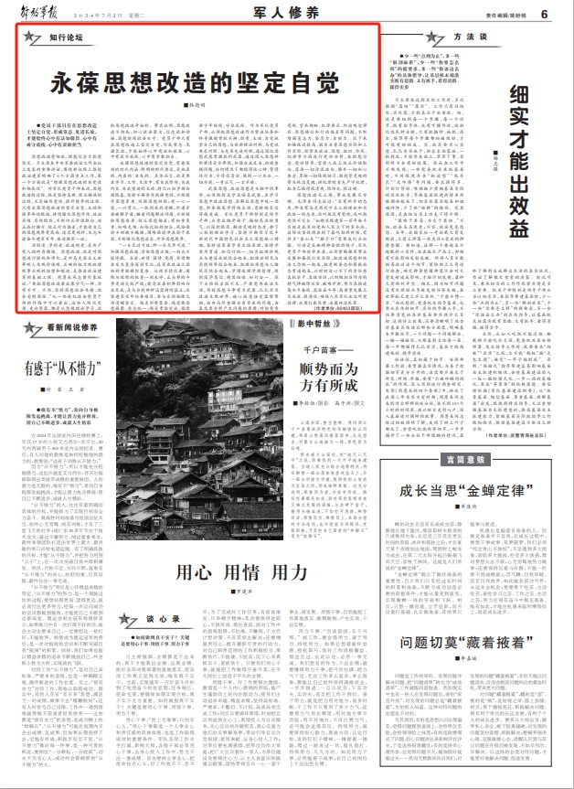 思想改造愈徹底,理想信念才能愈堅定。習主席在中央軍委政治工作會議上發(fā)表的重要講話,圍繞新征程上推進政治建軍明確了6個方面重點工作,第一個方面就是“增強思想改造的自覺性和徹底性”。對軍隊黨員干部來說,思想改造的過程,既是堅持真理、修正錯誤的過程,又是錘煉黨性、提升境界的過程。只有永葆思想改造的堅定自覺,主動加強革命性鍛造,持續(xù)強化思想淬煉、政治歷練、實踐鍛煉,不斷歸正價值取向、端正品行操守、校正行為偏差,才能使自己的思想境界更高尚、追求更純粹,矢志不渝奮斗建軍百年、奮進強軍一流。