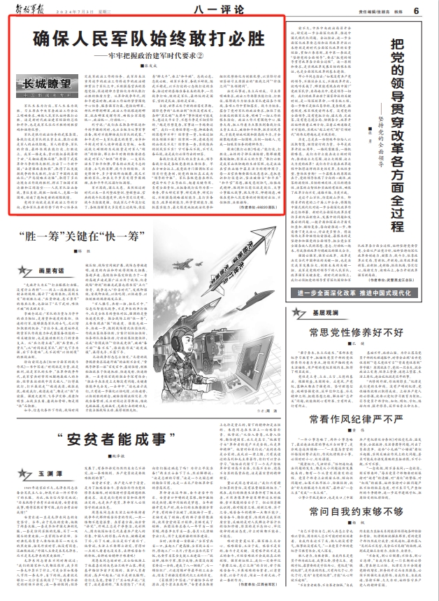 黨的方向就是我軍政治工作的方向,黨和軍隊(duì)在新形勢(shì)下的中心任務(wù)決定我軍政治工作的任務(wù)。我軍歷來注重用進(jìn)步的政治工作將進(jìn)步的政治精神貫注于軍隊(duì)之中,不斷提高官兵的思想覺悟,促進(jìn)精神力量轉(zhuǎn)化為部隊(duì)敢打必勝的物質(zhì)力量。從革命戰(zhàn)爭年代,到和平建設(shè)時(shí)期,政治工作始終緊緊圍繞中心任務(wù)、服務(wù)強(qiáng)軍打贏,黨指向哪里、部隊(duì)沖鋒到哪里,政治工作就跟進(jìn)到哪里、就在哪里發(fā)揮作用,確保全軍思想統(tǒng)一、政治統(tǒng)一、行動(dòng)統(tǒng)一。