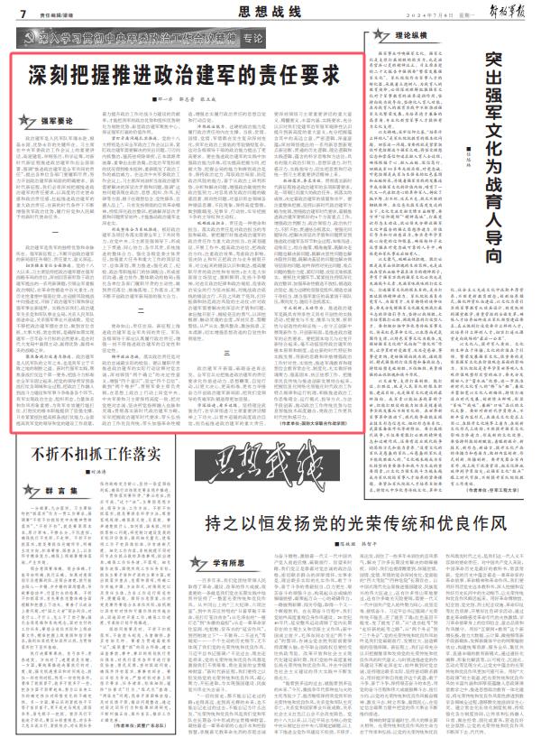 使命如山,責(zé)任在肩。新征程上推進政治建軍是全軍共同的責(zé)任。軍隊各級領(lǐng)導(dǎo)干部應(yīng)認(rèn)真履行政治責(zé)任,增強一刻不停推進政治建軍的自覺性和堅定性。
