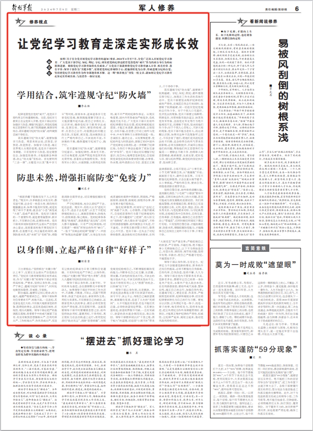 按照《關(guān)于在全黨開展黨紀(jì)學(xué)習(xí)教育的通知》要求,2024年4月至7月,全黨廣泛深入開展黨紀(jì)學(xué)習(xí)教育。廣大黨員干部學(xué)紀(jì)、知紀(jì)、明紀(jì)、守紀(jì),切實(shí)把黨的紀(jì)律這把管黨治黨的“戒尺”作為約束自身行為的標(biāo)準(zhǔn)和遵循。確保黨紀(jì)學(xué)習(xí)教育取得扎實(shí)成效,廣大黨員干部就要將黨紀(jì)學(xué)習(xí)教育融入日常、抓在經(jīng)常、落在平常;領(lǐng)導(dǎo)干部作為“關(guān)鍵少數(shù)”,更要把黨的紀(jì)律刻印于心,把他律轉(zhuǎn)化為自律,形成遵規(guī)守紀(jì)的自覺(jué),堅(jiān)持把黨紀(jì)學(xué)習(xí)教育作為終身課題常抓不懈。這一期“修養(yǎng)視點(diǎn)”刊發(fā)一組文章,就如何讓黨紀(jì)學(xué)習(xí)教育走深走實(shí)形成長(zhǎng)效,與讀者作一探討交流。