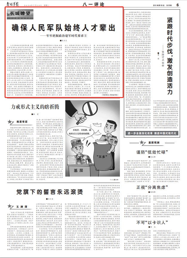 習(xí)主席在中央軍委政治工作會議上,深刻闡明政治建軍時(shí)代要求,特別強(qiáng)調(diào)要確保人民軍隊(duì)始終人才輩出。這充分體現(xiàn)了習(xí)主席對世界軍事人才競爭形勢的準(zhǔn)確判斷,對人才強(qiáng)則事業(yè)強(qiáng)、人才興則軍隊(duì)興規(guī)律的深刻把握。我們要全面把握新時(shí)代人才強(qiáng)軍戰(zhàn)略,以更加積極、更有活力、更加有效的人才政策,打造規(guī)模宏大、結(jié)構(gòu)合理、素質(zhì)優(yōu)良的革命化、專業(yè)化軍事人才方陣。