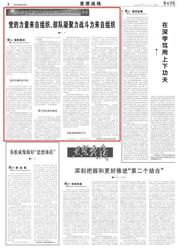 堅(jiān)強(qiáng)有力的黨組織,是我軍的優(yōu)勢(shì)所在、力量所在。習(xí)主席在中央軍委政治工作會(huì)議上,將新時(shí)代政治建軍方略凝練概括為“十個(gè)明確”,“明確黨的力量來(lái)自組織、部隊(duì)凝聚力戰(zhàn)斗力來(lái)自組織”是其中重要一條。軍隊(duì)各級(jí)黨組織是黨領(lǐng)導(dǎo)和掌握軍隊(duì)的組織支撐,擔(dān)負(fù)著實(shí)現(xiàn)黨對(duì)軍隊(duì)絕對(duì)領(lǐng)導(dǎo)、團(tuán)結(jié)鞏固部隊(duì)、完成各項(xiàng)任務(wù)的重要責(zé)任,是軍隊(duì)強(qiáng)大戰(zhàn)斗力的基本依托。新時(shí)代新征程,軍隊(duì)各級(jí)黨組織只有堅(jiān)定正確政治方向、聚力深化練兵備戰(zhàn)、不斷涵養(yǎng)新風(fēng)正氣,才會(huì)充分激發(fā)部隊(duì)的凝聚力戰(zhàn)斗力,確保我軍永遠(yuǎn)聽(tīng)黨指揮、永固打贏優(yōu)勢(shì)、永葆純潔光榮。