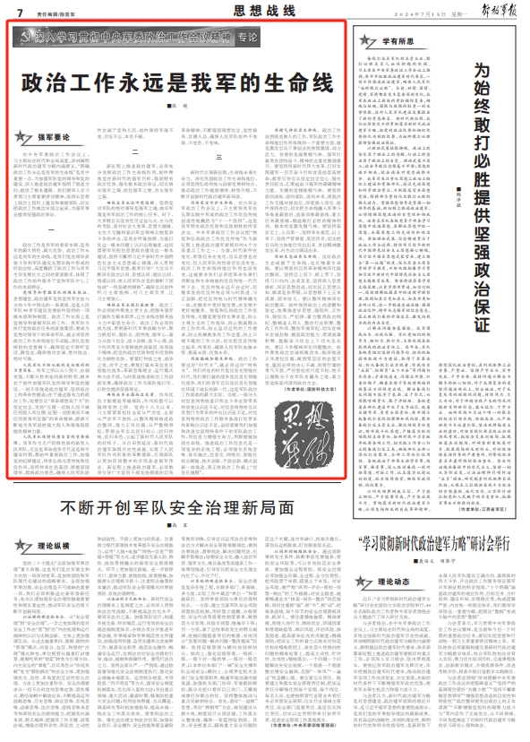 新征程上推進(jìn)政治建軍,必須充分發(fā)揮政治工作生命線作用,始終聚焦黨在新時代的強軍目標(biāo),強固特有政治優(yōu)勢,強化根本政治保證,切實鑄牢強軍之魂、扭住強軍之要、夯實強軍之基。