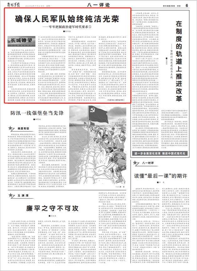 習(xí)主席在中央軍委政治工作會議上,深刻闡明政治建軍時代要求,特別強(qiáng)調(diào)要確保人民軍隊始終純潔光榮。這充分體現(xiàn)了習(xí)主席對全面從嚴(yán)治黨、全面從嚴(yán)治軍的深謀遠(yuǎn)慮和深邃思考,對建軍治軍強(qiáng)軍規(guī)律的清醒認(rèn)識和準(zhǔn)確把握。我們應(yīng)牢牢把握政治建軍時代要求,發(fā)揚自我革命精神,聚焦政治建軍深層次矛盾和問題,深刻反思,認(rèn)真整改,確保我軍永遠(yuǎn)聽黨指揮、永固打贏優(yōu)勢、永葆純潔光榮。