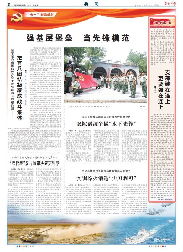 習(xí)主席強(qiáng)調(diào),支部建在連上,是我軍的優(yōu)良傳統(tǒng),也是黨領(lǐng)導(dǎo)軍隊的重要原則和制度。加強(qiáng)基層建設(shè),必須扭住黨組織這個關(guān)鍵,充分發(fā)揮其戰(zhàn)斗堡壘作用和廣大黨員先鋒模范作用。