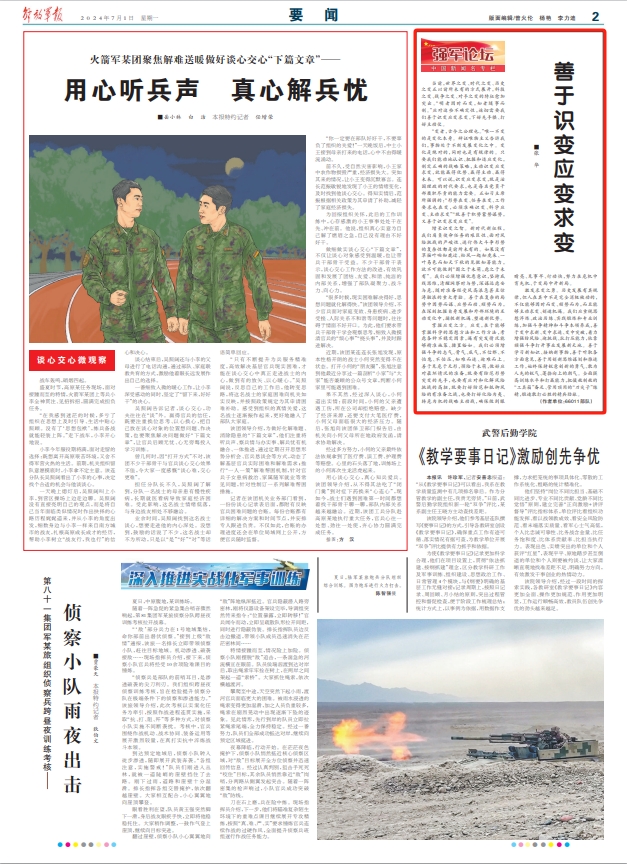 激發(fā)求變之勇。歷史發(fā)展有其規(guī)律,但人在其中不是完全消極被動(dòng)的,不僅能夠因時(shí)而變、順勢(shì)而為,而且能夠主動(dòng)求變、創(chuàng)造機(jī)遇。我們應(yīng)重視思想淬煉、政治歷練、實(shí)踐鍛煉和專業(yè)訓(xùn)練,加強(qiáng)斗爭(zhēng)精神和斗爭(zhēng)本領(lǐng)養(yǎng)成,善于變中求新、變中求進(jìn)、變中突破,著力增強(qiáng)防風(fēng)險(xiǎn)、迎挑戰(zhàn)、抗打壓能力,依靠頑強(qiáng)斗爭(zhēng)打開(kāi)事業(yè)發(fā)展新天地。善于學(xué)習(xí)新知識(shí)、接納新事物,善于聽(tīng)取各方面意見(jiàn),善于用創(chuàng)新思維謀劃和推進(jìn)工作,始終保持銳意創(chuàng)新的勇氣、敢為人先的銳氣、蓬勃向上的朝氣。全面提高訓(xùn)練水平和打贏能力,把懾?cái)持茢车摹肮ぞ呦洹眰渥?、管用頂用的“刀尖子”練精,鍛造敢打必勝的精兵勁旅?/p>
