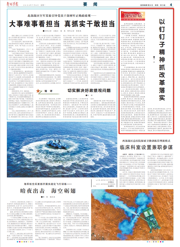習(xí)主席強(qiáng)調(diào)指出,要以釘釘子精神抓改革落實(shí),既要積極主動(dòng),更要扎實(shí)穩(wěn)健,明確優(yōu)先序,把握時(shí)度效,盡力而為、量力而行,不能脫離實(shí)際。深化國(guó)防和軍隊(duì)改革大開大合、大破大立、蹄疾步穩(wěn),這一輪改革任務(wù)基本完成。我們應(yīng)總結(jié)運(yùn)用改革成功經(jīng)驗(yàn),把握新的形勢(shì)和任務(wù)要求,聚焦備戰(zhàn)打仗,勇于開拓創(chuàng)新,扎實(shí)抓好既定改革任務(wù)落實(shí)。對(duì)定下來的改革舉措要不折不扣貫徹執(zhí)行,一心一意攻堅(jiān)克難往前推。越是任務(wù)重、困難大,越要知難而進(jìn)、迎難而上,有定力、有擔(dān)當(dāng)、有韌勁,確保各項(xiàng)改革舉措落實(shí)、落細(xì)、落穩(wěn)。