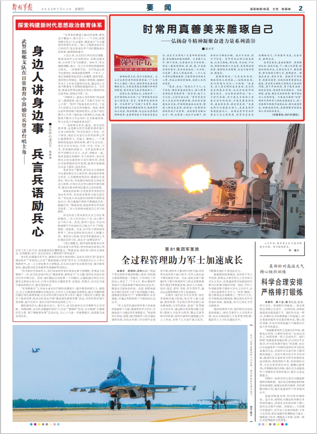 追尋真善美,基礎(chǔ)在勤學。既要惜時如金、孜孜不倦,下一番心無旁騖、靜謐自怡的功夫,又要突出主干、擇其精要,努力做到又博又專、愈博愈專。擁抱真善美,貴在多思。要把學習同思考、觀察同思考、實踐同思考緊密結(jié)合起來,學會用正確的立場觀點方法分析問題,勇于開拓實踐,勇于探索真理。成就真善美,需涵養(yǎng)自處的能力。無論順境、逆境,都是生活的風景,都可轉(zhuǎn)化為人生的財富。只要我們按照“四有”新時代革命軍人的標準塑造自己,就一定能夠不斷提升道德認知、強化道德養(yǎng)成、加強道德實踐,在強國強軍的新征程上書寫新的榮光。