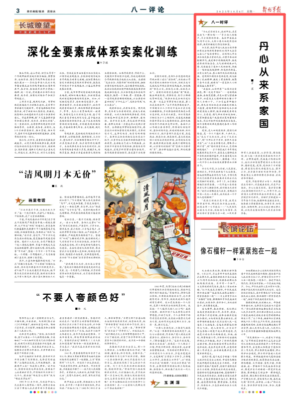 愛國,不能停留在口號上,而要落實(shí)在行動中;不是喊出來的,而是干出來的。丹心從來系家國。每名官兵都應(yīng)把家國情懷內(nèi)化于心、外化于行,把愛國主義精神體現(xiàn)在本職崗位上,落實(shí)到實(shí)際行動中。要錨定實(shí)現(xiàn)建軍一百年奮斗目標(biāo),把精神狀態(tài)激發(fā)出來,把奮進(jìn)力量凝聚起來,知重負(fù)重、知難克難、知險化險,全力以赴打好攻堅(jiān)之戰(zhàn),以優(yōu)異成績向黨和人民交出合格答卷。