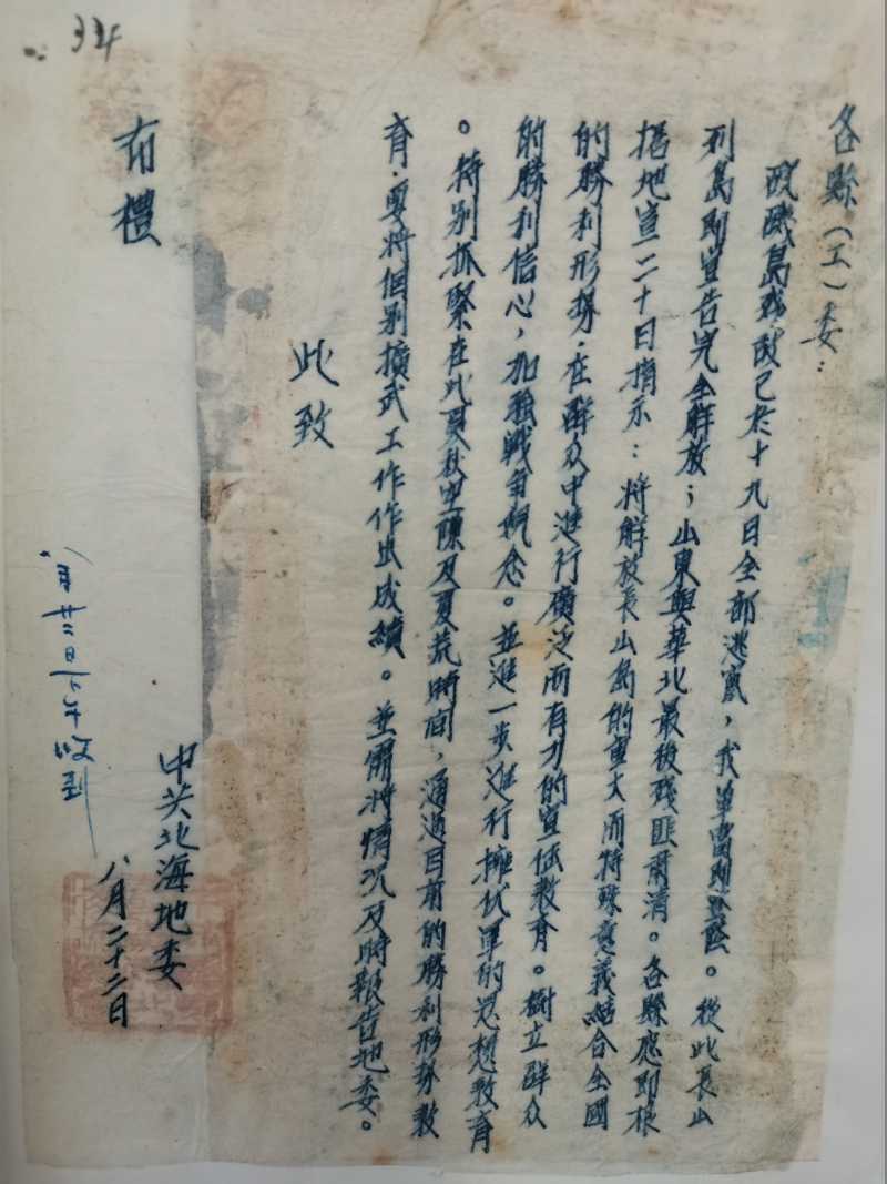 ▲中共北海地委給各縣(工)委關(guān)于砣磯島殘敵于1949年8月19日全部逃竄的通知。