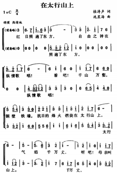 1938年6月下旬,桂濤聲回到武漢,富有鼓動性、戰(zhàn)斗性的抗日歌曲《在太行山上》的歌詞已醞釀成熟。南太行赭紅色絕壁從華北平原拔地而起的雄姿,以及縈繞其間決死抵抗的洶涌民情,通過他滾燙的歌詞,如同狼煙烽火,瞬間點燃了冼星海的澎湃激情。武昌曇華林國民政府軍事委員會政治部第三廳駐地,在借來的一架鋼琴上,歌詞插上了音樂的翅膀。“紅日照遍了東方,自由之神在縱情歌唱!看吧!千山萬壑,銅壁鐵墻,抗日的烽火燃燒在太行山上,氣焰千萬丈,聽吧!母親叫兒打東洋,妻子送郎上戰(zhàn)場。我們在太行山上,我們在太行山上,山高林又密,兵強(qiáng)馬又壯。敵人從哪里進(jìn)攻,我們就要他在哪里滅亡!敵人從哪里進(jìn)攻,我們就要他在哪里滅亡!”