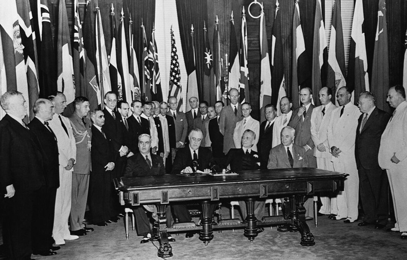 ▲1942年1月,反法西斯同盟國(guó)代表在《聯(lián)合國(guó)家宣言》上簽字。