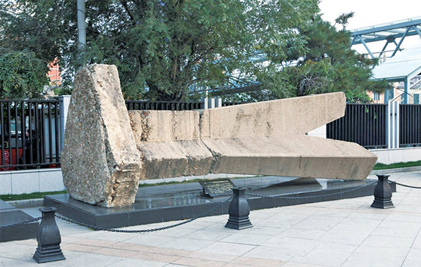 ▲陳列在沈陽(yáng)“九·一八”歷史博物館殘歷碑廣場(chǎng)的“炸彈碑”?!≠Y料照片