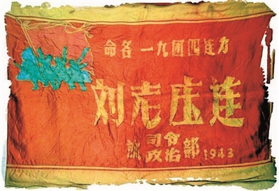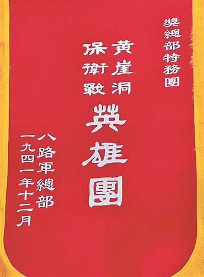 ▲“黃崖洞保衛(wèi)戰(zhàn)英雄團(tuán)”戰(zhàn)旗。