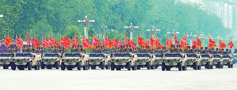 ▲80面抗戰(zhàn)英模部隊(duì)榮譽(yù)旗幟組成的戰(zhàn)旗方隊(duì)?!≈袊?guó)國(guó)防報(bào)記者劉萬(wàn)平攝