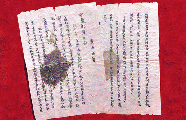 ▲烈士張志年留下的帶血的入黨申請書。 于烜浩攝