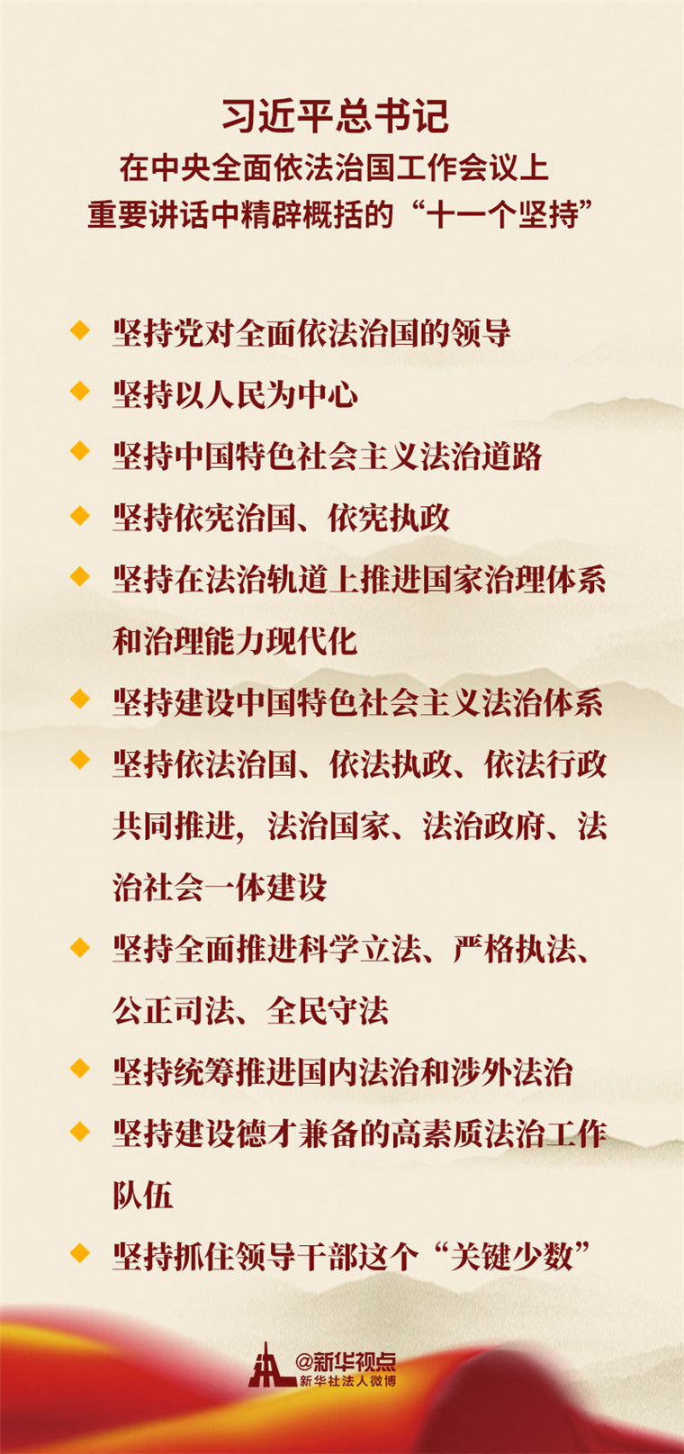 這“十一個堅持”,系統(tǒng)闡述了新時代全面依法治國的戰(zhàn)略思想和工作部署,深刻回答了新時代為什么實行全面依法治國、怎樣實行全面依法治國等一系列重大問題,是新時代全面依法治國的根本遵循和行動指南。