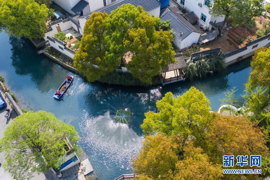 浙江省長(zhǎng)興縣龍山街道渚山村,保潔人員進(jìn)行日常河道護(hù)理巡查(4月9日攝,無(wú)人機(jī)照片)。新華社記者 徐昱 攝