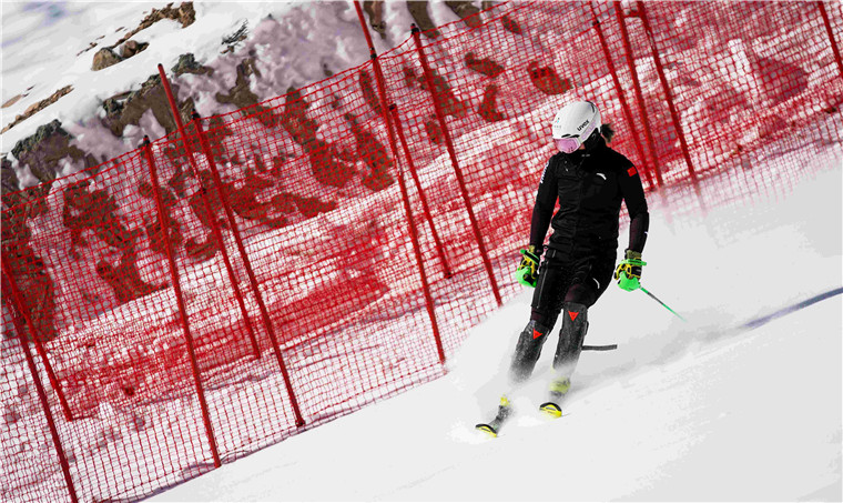 △中國高山滑雪隊(duì)隊(duì)員張玉營在北京冬奧會延慶賽區(qū)場地進(jìn)行回轉(zhuǎn)訓(xùn)練。(總臺國廣記者李晉拍攝)