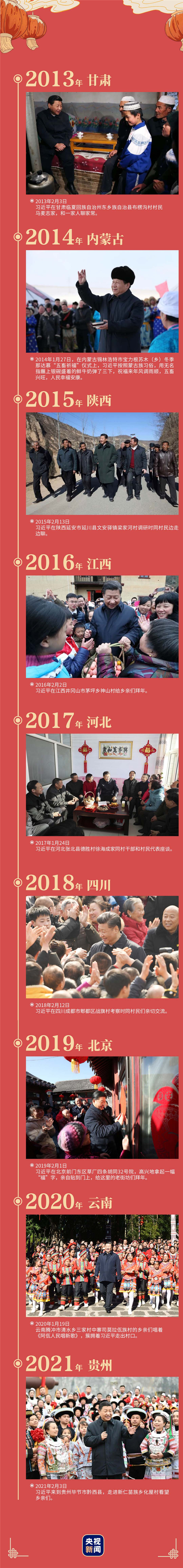 從2013年起,每逢春節(jié)前夕,習(xí)近平總書記都會來到人民群眾中。從冰天雪地的內(nèi)蒙古草原到霜天寥廓的張家口農(nóng)家,從革命老區(qū)延安到紅色圣地井岡山,從四川涼山彝族自治州到云南的佤寨司莫拉村……總書記向大家送上新春祝福。