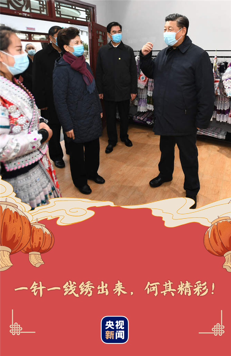 習(xí)近平向村民詳細(xì)詢問制作工藝流程,對大家說:“把苗繡發(fā)揚(yáng)光大,傳統(tǒng)的也是時尚的。它既是文化又是產(chǎn)業(yè)。”