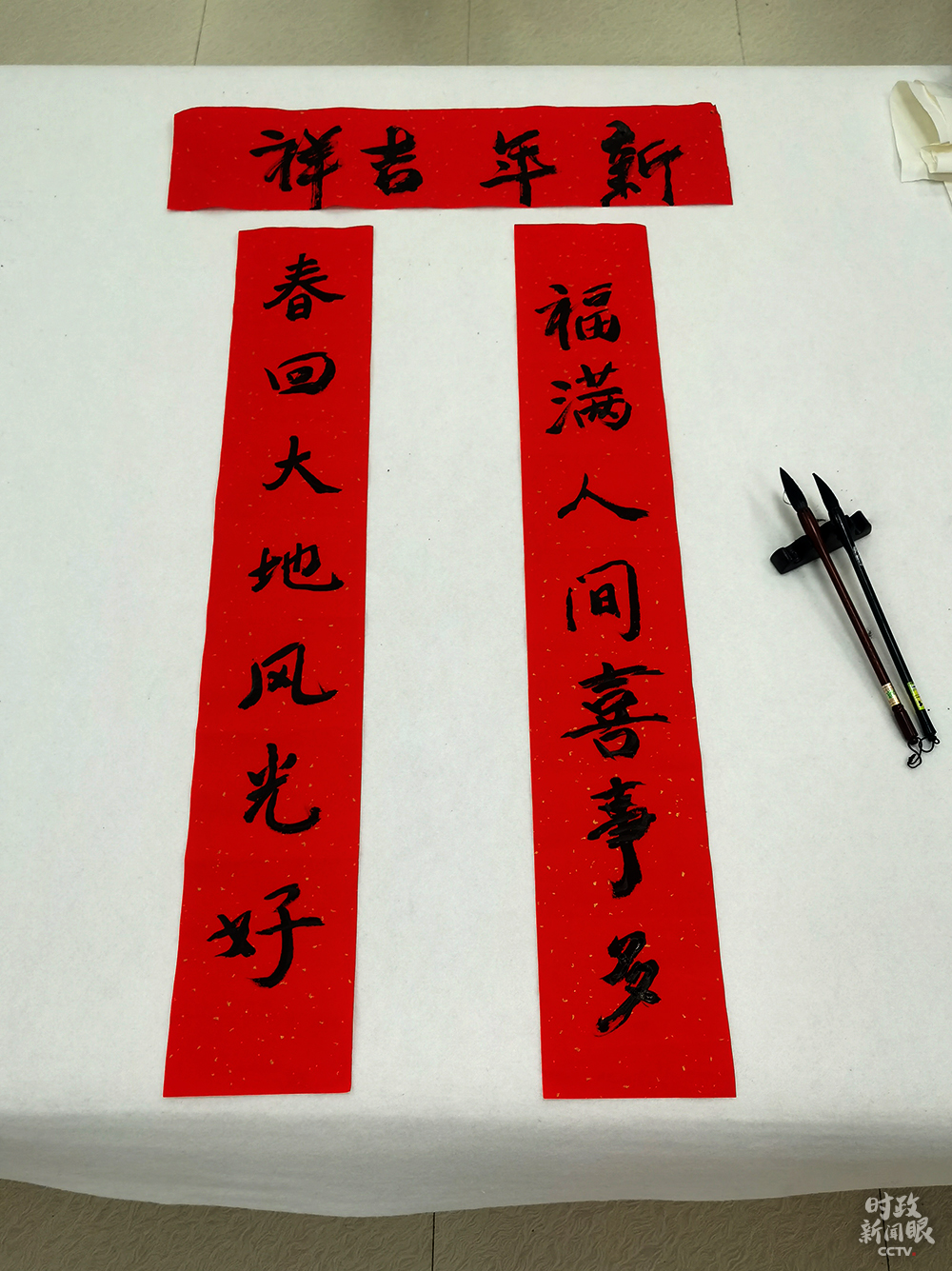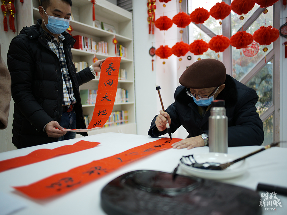 △84歲的社區(qū)居民戴世倫老先生,曾在貴州廣播電視大學(xué)任教。這是他寫(xiě)的春聯(lián)。(總臺(tái)央視記者彭漢明、姚瑤拍攝)