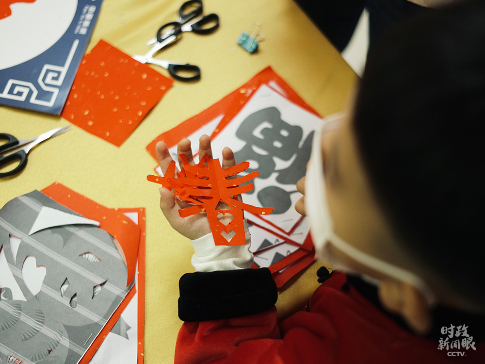 △孩子們?cè)谏鐓^(qū)活動(dòng)室練習(xí)剪紙。(總臺(tái)央視記者王哈男拍攝)