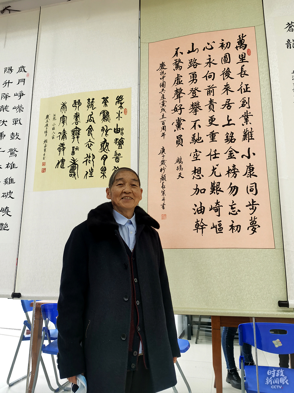 △這是87歲的社區(qū)居民顏長(zhǎng)策老先生為慶祝中國(guó)共產(chǎn)黨成立100周年創(chuàng)作并書(shū)寫(xiě)的詩(shī)作。(總臺(tái)央視記者姚瑤拍攝)