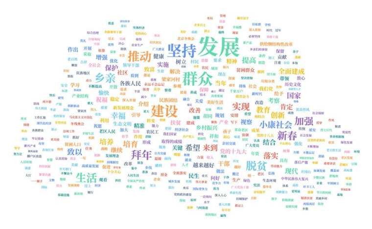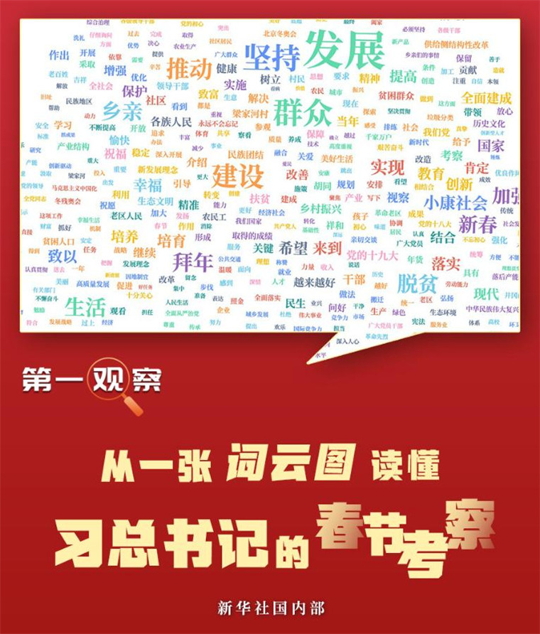 我們對(duì)十八大以來(lái)總書(shū)記春節(jié)考察的新聞報(bào)道做了統(tǒng)計(jì)分析。在呈現(xiàn)眼前的詞云圖上,“發(fā)展”“群眾”“建設(shè)”“鄉(xiāng)親”“小康社會(huì)”“脫貧”“創(chuàng)新”“生態(tài)文明”等成為“高頻詞”。這從一個(gè)側(cè)面反映了習(xí)近平總書(shū)記的關(guān)心、關(guān)注和關(guān)切。梳理這些高頻詞,可以觀察解讀出幾層深意——