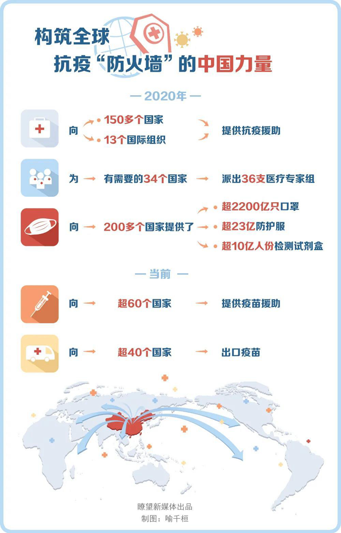 世界聽到中國聲音,更見到中國行動(dòng)。2020年,中國向150多個(gè)國家和13個(gè)國際組織提供抗疫援助,向有需要的34個(gè)國家派出36支醫(yī)療專家組,向200多個(gè)國家提供了超過2200億只口罩、23億件防護(hù)服、10億人份檢測(cè)試劑盒。當(dāng)前,中國已向超過60個(gè)國家提供疫苗援助,向超過40個(gè)國家出口疫苗,扎實(shí)履行將疫苗作為全球公共產(chǎn)品的大國承諾。