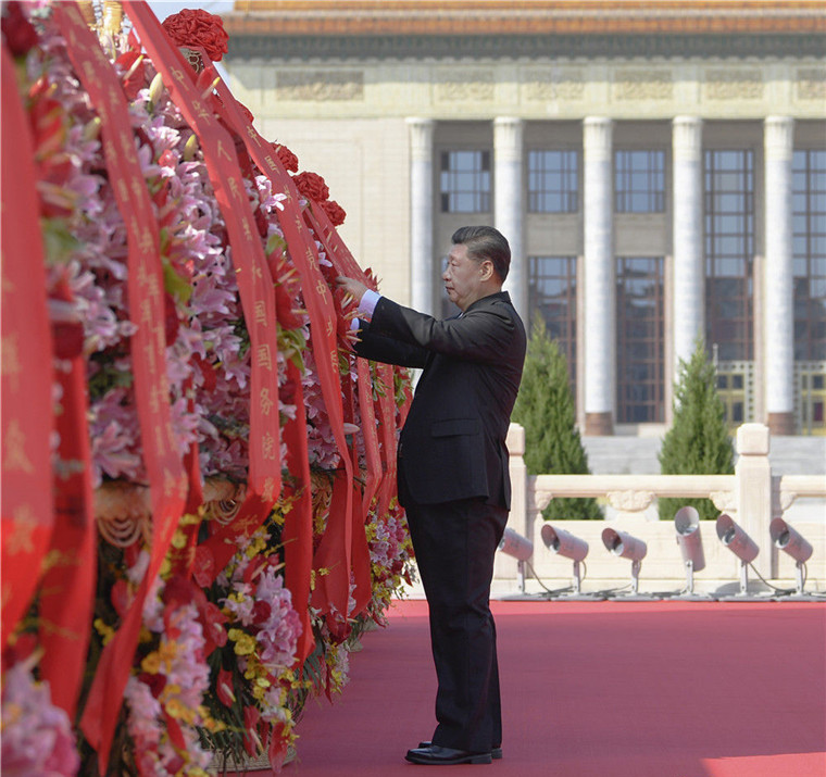2020年9月30日,習近平出席烈士紀念日向人民英雄敬獻花籃儀式。這是習近平整理花籃上的緞帶。