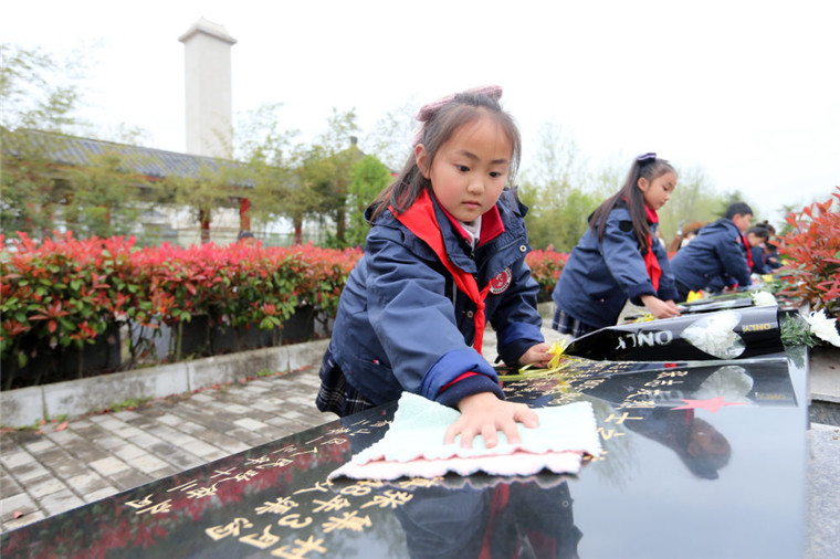 2021年4月1日,在安徽省淮北市相山區(qū)烈士陵園,淮北市泉山路學校學生擦拭烈士墓。
