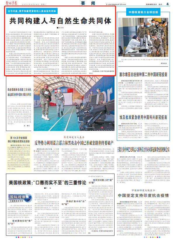共建人與自然生命共同體,中國(guó)展現(xiàn)大國(guó)擔(dān)當(dāng)。“十四五”規(guī)劃和2035年遠(yuǎn)景目標(biāo)綱要提出,要堅(jiān)持公平、共同但有區(qū)別的責(zé)任及各自能力原則,建設(shè)性參與和引領(lǐng)應(yīng)對(duì)氣候變化國(guó)際合作,推動(dòng)落實(shí)聯(lián)合國(guó)氣候變化框架公約及其巴黎協(xié)定,積極開(kāi)展氣候變化南南合作。中國(guó)作為全球生態(tài)文明建設(shè)的參與者、貢獻(xiàn)者、引領(lǐng)者,堅(jiān)定踐行多邊主義,既加強(qiáng)自身生態(tài)文明建設(shè),又主動(dòng)承擔(dān)應(yīng)對(duì)氣候變化、保護(hù)生物多樣性的國(guó)際責(zé)任,切實(shí)幫助發(fā)展中國(guó)家提高相應(yīng)能力,體現(xiàn)了中國(guó)對(duì)全球環(huán)境治理的大國(guó)擔(dān)當(dāng)。未來(lái),中國(guó)愿與各國(guó)一道,共同構(gòu)建人與自然生命共同體,推進(jìn)全球環(huán)境治理朝著公平合理、合作共贏的方向發(fā)展,為應(yīng)對(duì)當(dāng)今世界面臨的全球性挑戰(zhàn)、解決人類面臨的共性問(wèn)題作出新的更大貢獻(xiàn)。