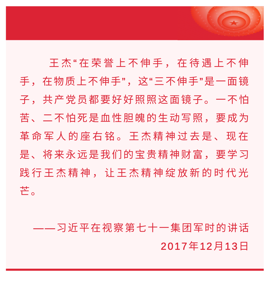 1965年11月27日,王杰犧牲4個(gè)多月后,他生前所在班被國防部命名為 “王杰班”;2015年,王杰犧牲50周年之際,他生前所在連隊(duì)被原南京軍區(qū)授予“弘揚(yáng)‘兩不怕’精神模范連”榮譽(yù)稱號。