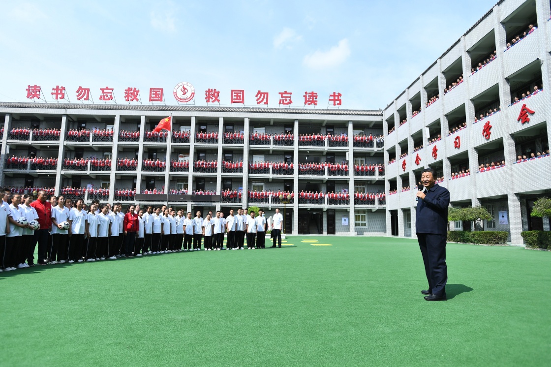 隨后,習(xí)近平來到綏德實(shí)驗(yàn)中學(xué),先后走進(jìn)教室、操場(chǎng),觀看同學(xué)們書法練習(xí)和體育鍛煉,同大家親切交流。他指出,中華文明源遠(yuǎn)流長(zhǎng)、綿延不斷,基礎(chǔ)在教育。實(shí)現(xiàn)中華民族偉大復(fù)興,基礎(chǔ)在教育。我們辦教育,就是要提高人民綜合素質(zhì),促進(jìn)人的全面發(fā)展,提升社會(huì)文明程度,堅(jiān)定文化自信,增強(qiáng)全民族創(chuàng)造活力。要全面貫徹黨的教育方針,落實(shí)立德樹人根本任務(wù),厚植愛黨、愛國(guó)、愛人民、愛社會(huì)主義的情感,努力培養(yǎng)德智體美勞全面發(fā)展的社會(huì)主義建設(shè)者和接班人。要深化教育教學(xué)改革,強(qiáng)化學(xué)校教育主陣地作用,全面提高學(xué)校教學(xué)質(zhì)量,真正把過重的學(xué)業(yè)負(fù)擔(dān)和校外培訓(xùn)負(fù)擔(dān)減下來,辦好人民滿意的教育。最后,習(xí)近平勉勵(lì)同學(xué)們珍惜大好年華,修身立德、勤學(xué)上進(jìn)、強(qiáng)健體魄、錘煉意志,做對(duì)國(guó)家、對(duì)人民、對(duì)社會(huì)有用的人。